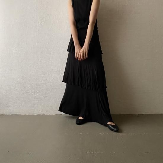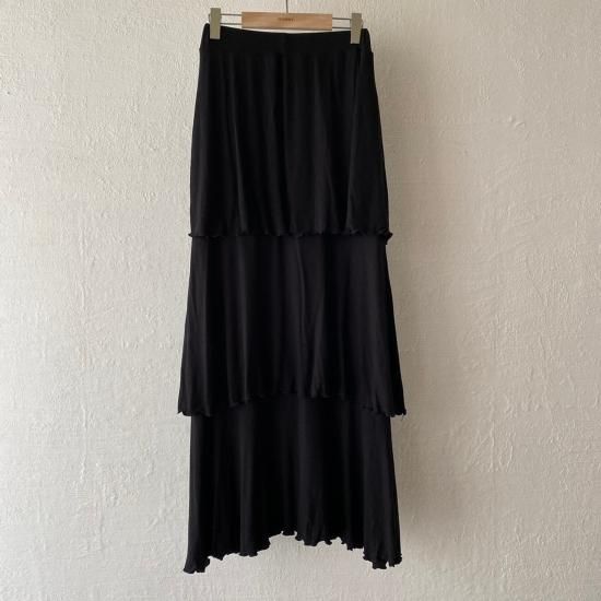 着心地の良い柔らかな細いリブ生地をふんだんに使用し、カジュアルながらも華やかなスカートに仕上がりました