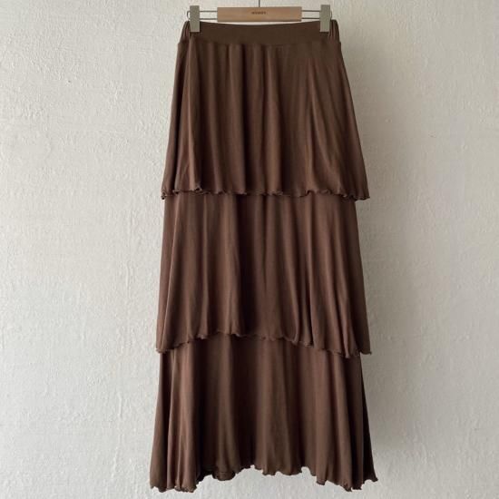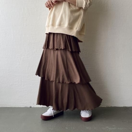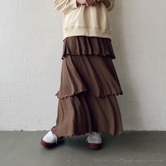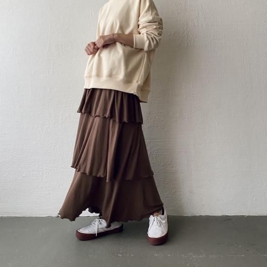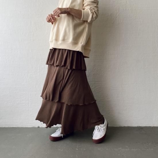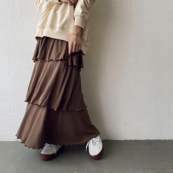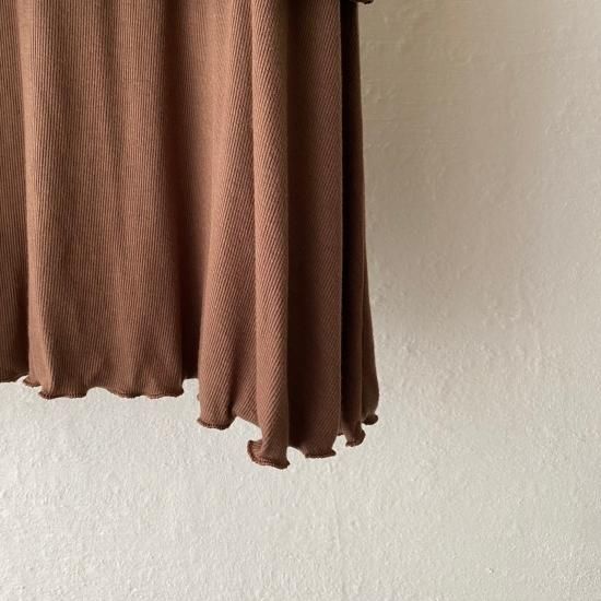 着心地の良い柔らかな細いリブ生地をふんだんに使用し、カジュアルながらも華やかなスカート