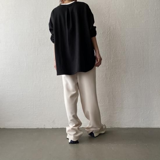 ウエストフロント部分のデザインが特徴でシルエットを重視し、こちらのパンツはゴムなしになります。