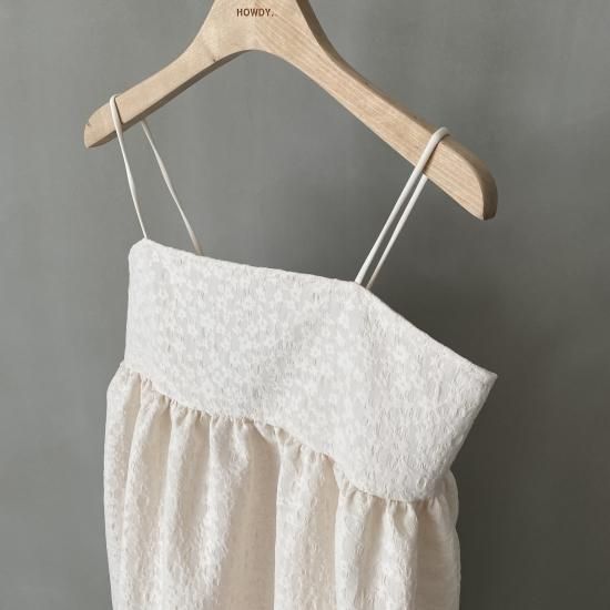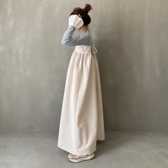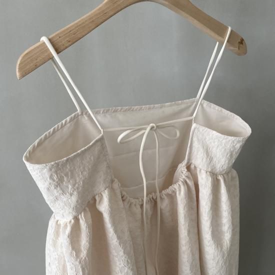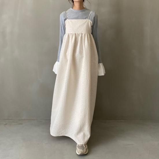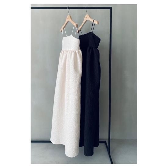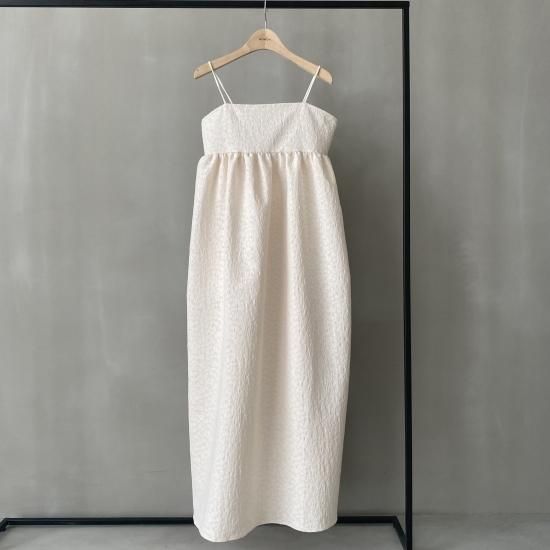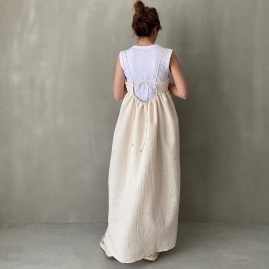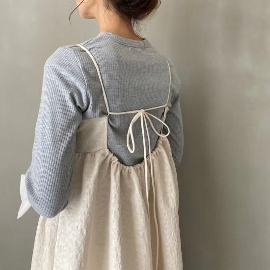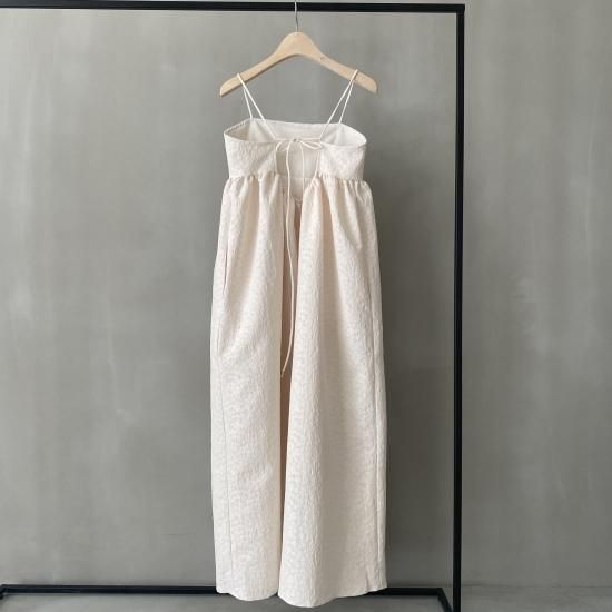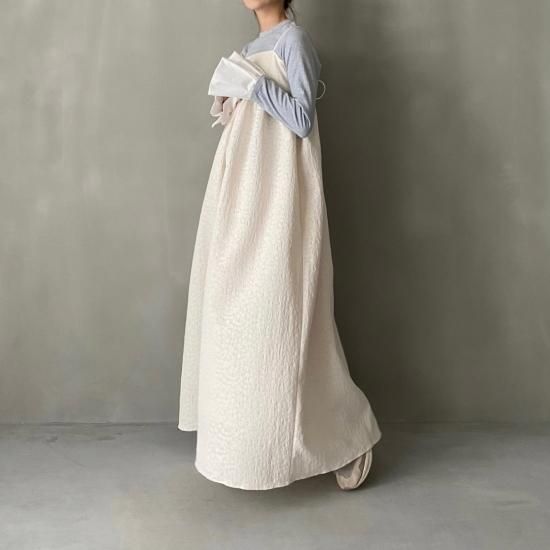 胸下より広がる美しいフレアシルエットとハリ感のある風合いと華奢なストラップはcamisole・flare opと変わらず、ストラップはお好みの位置で結んでいただけ、幅広い体型の方にご着用いただけます