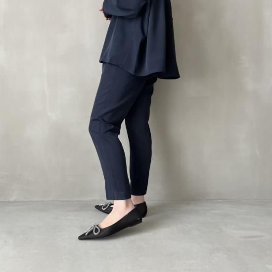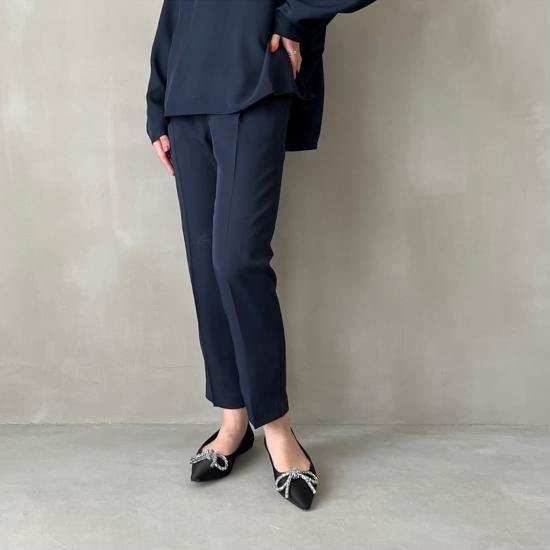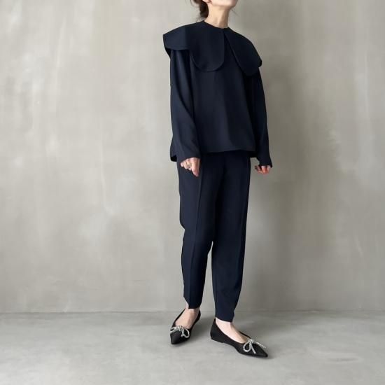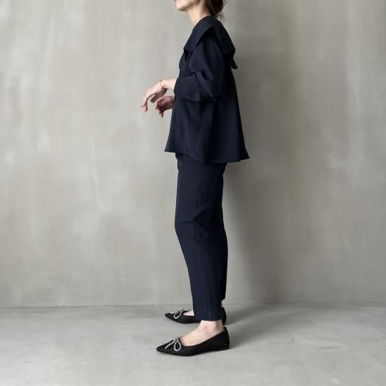 アクセサリーや合わせるシューズ次第でオケージョンにも、デイリーにも使える万能ブラウスとパンツです