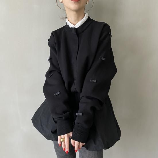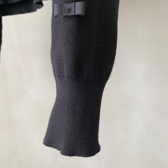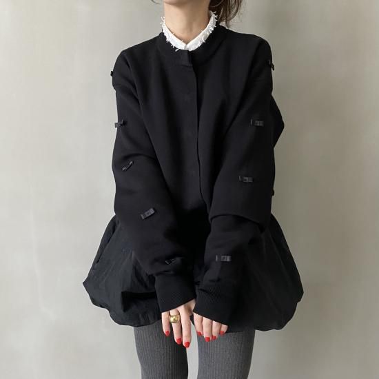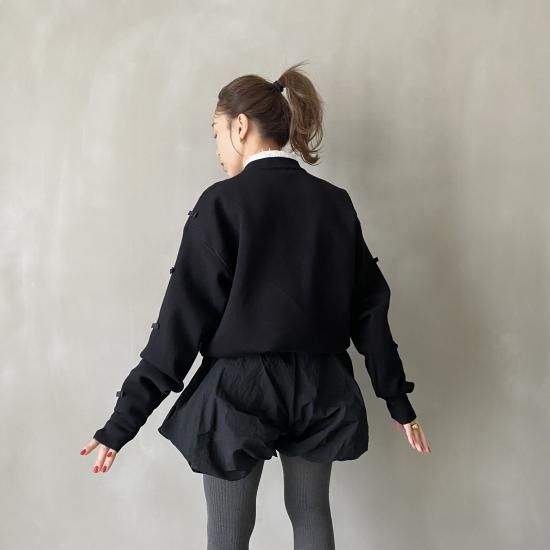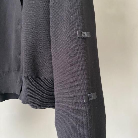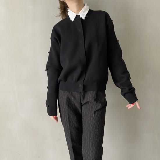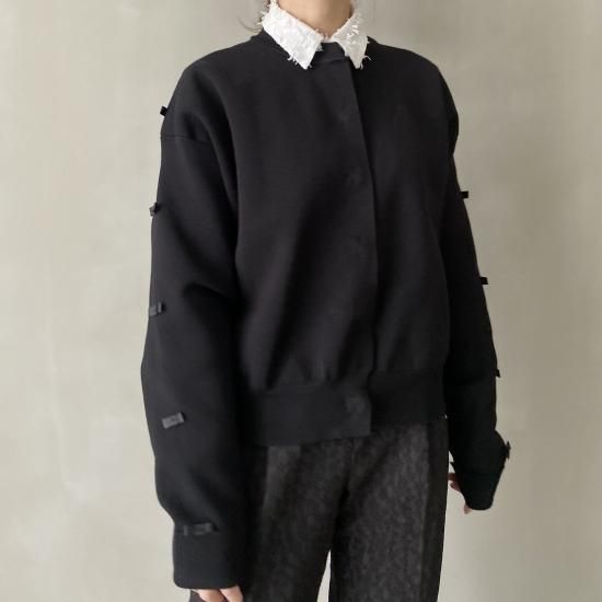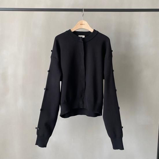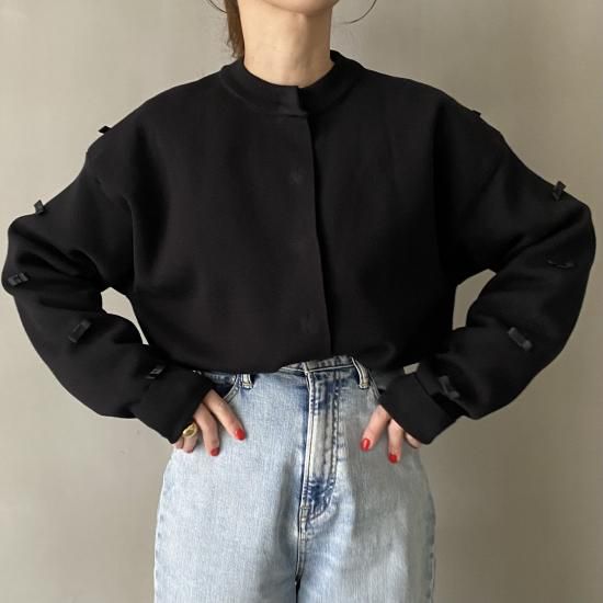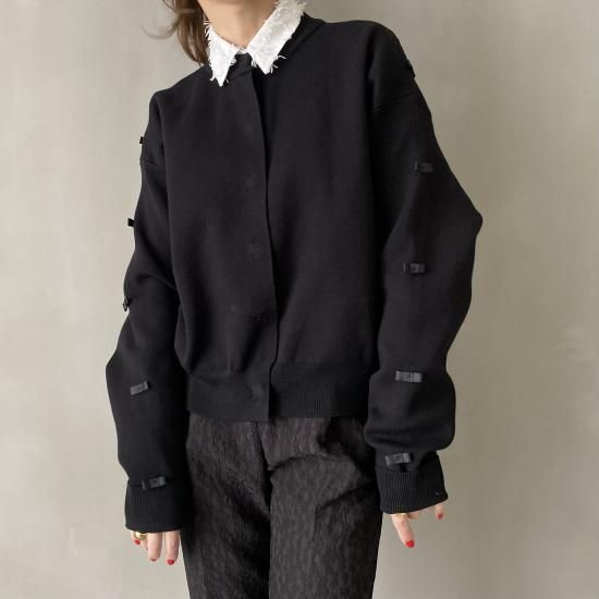 袖に施したリボンが目をひくリボンスリーブカーディガン