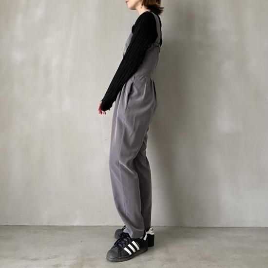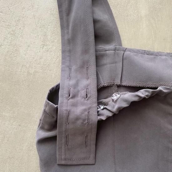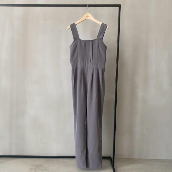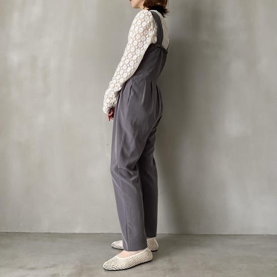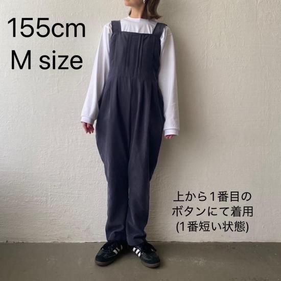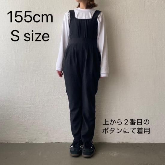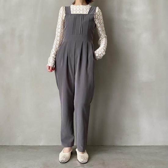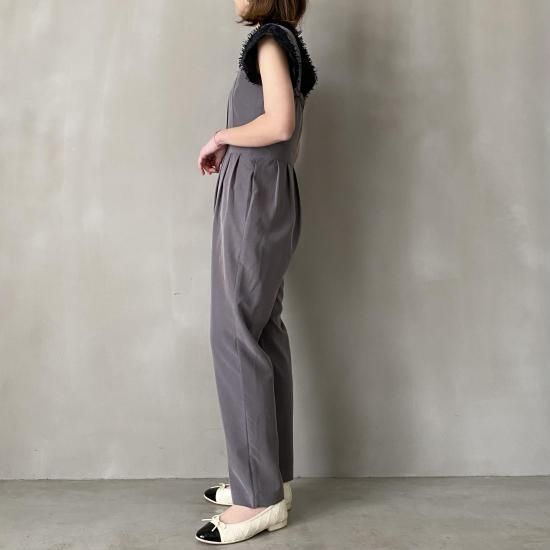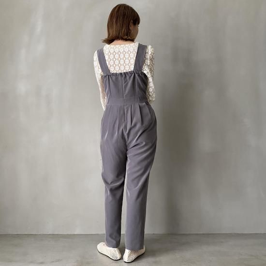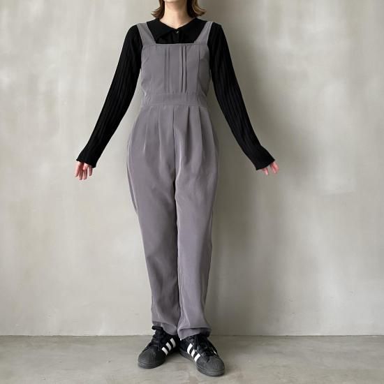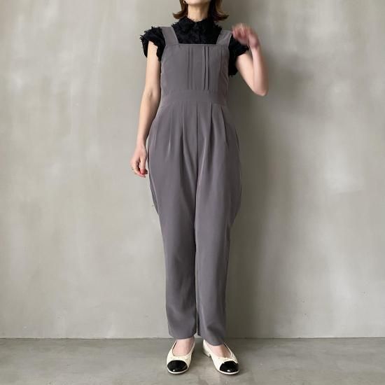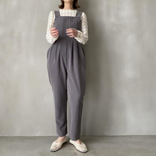 ボトム部分はタックデザインを施したテーパードシルエットですっきりとしたラインに。大人がオシャレに着れるマニッシュな印象のサロペットに仕上げました。