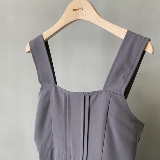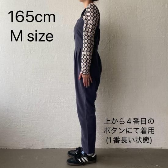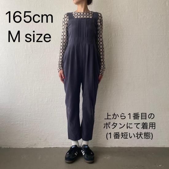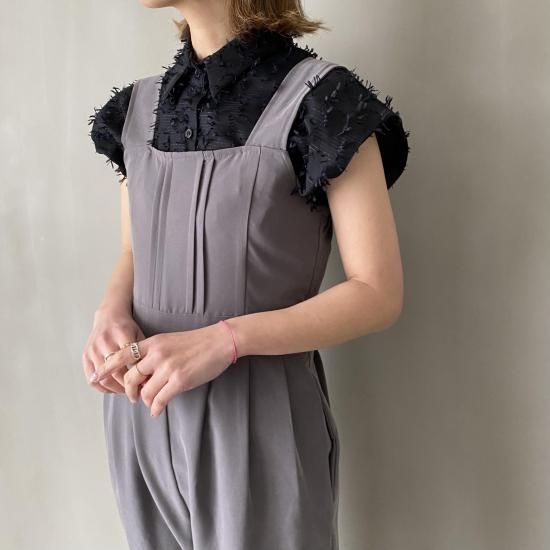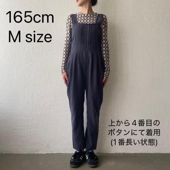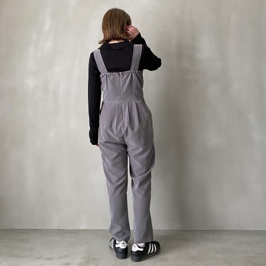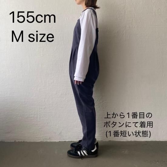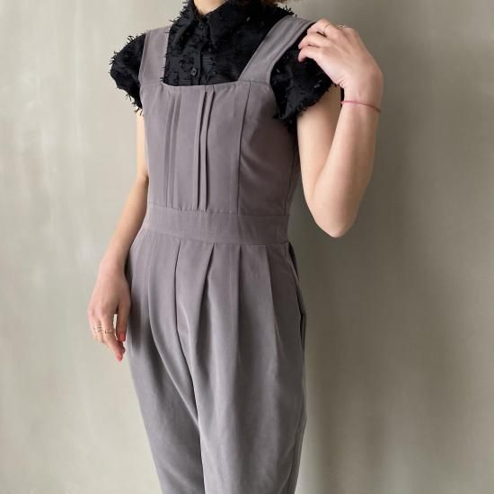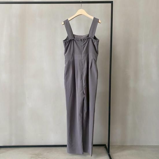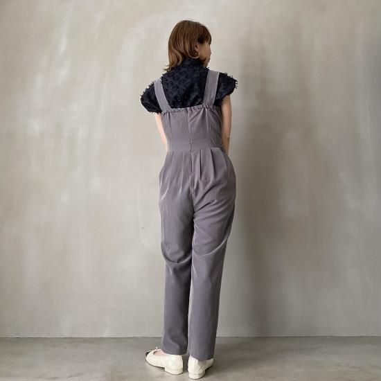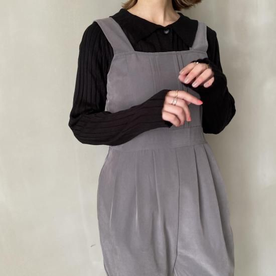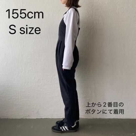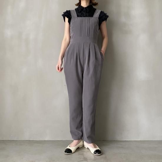 ボトム部分はタックデザインを施したテーパードシルエットですっきりとしたラインに。大人がオシャレに着れるマニッシュな印象のサロペットに仕上げました。