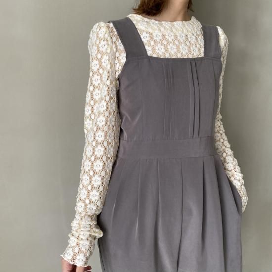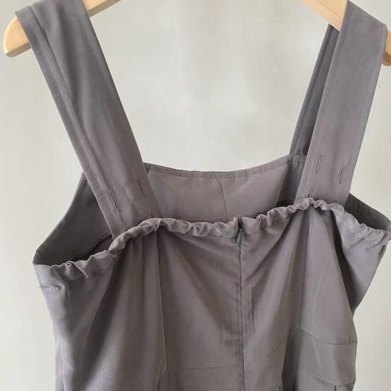 インナーを選ばないシンプルなデザインに加えスクエアネックと太めのストラップが全体に抜け感を与え1枚でもカッコよく決まる大人サロペット