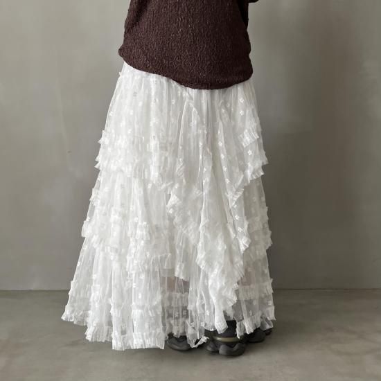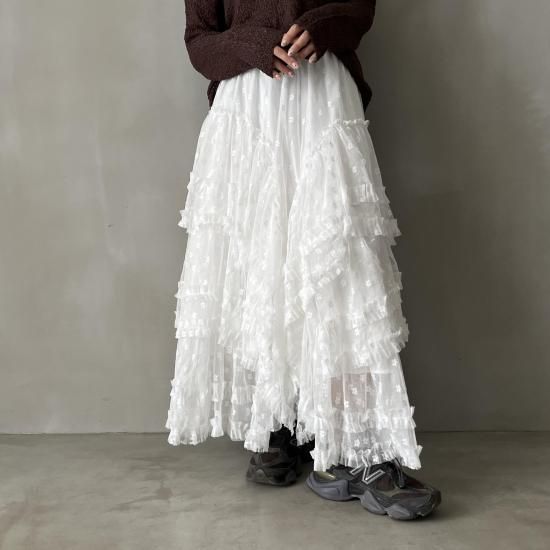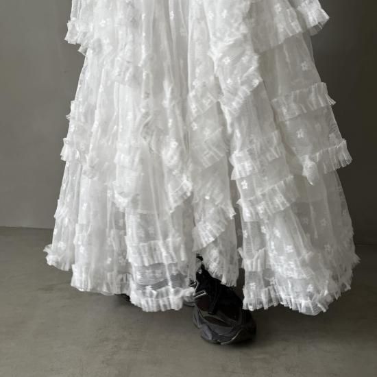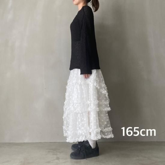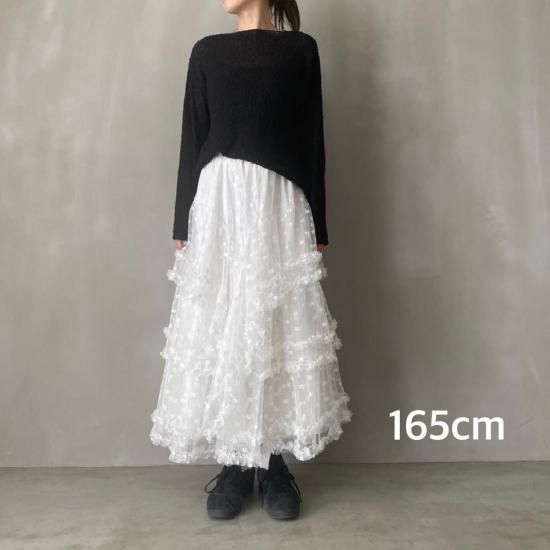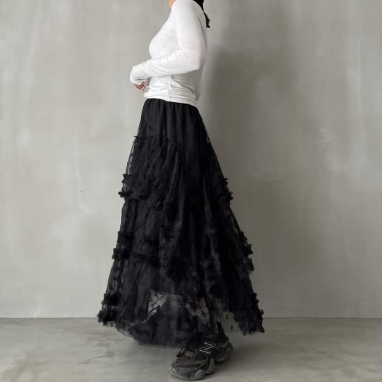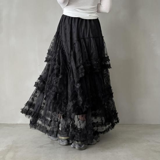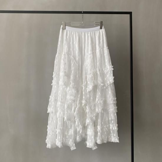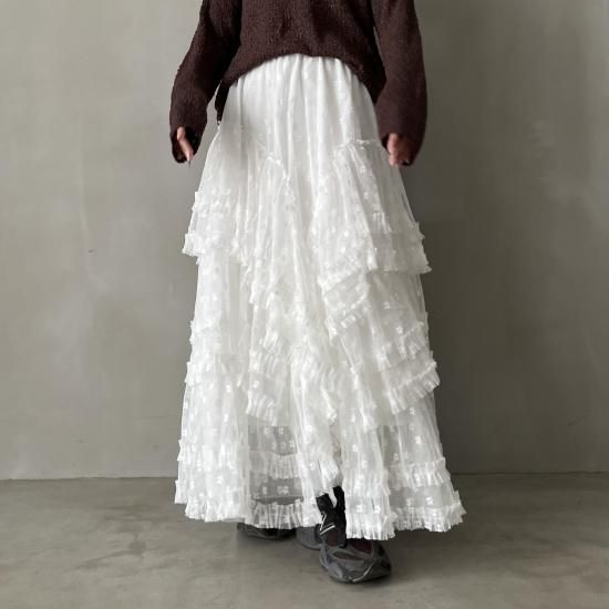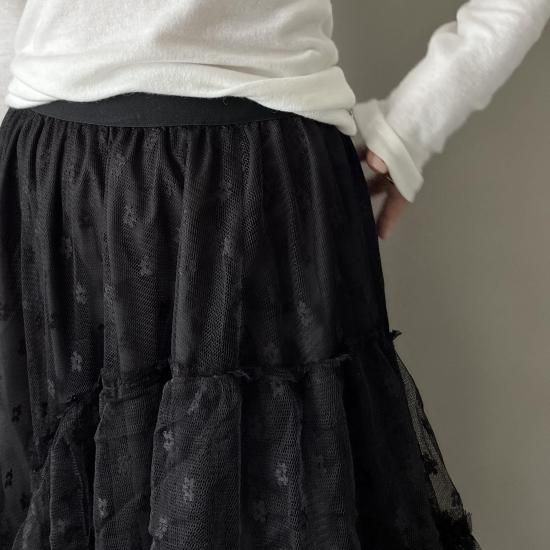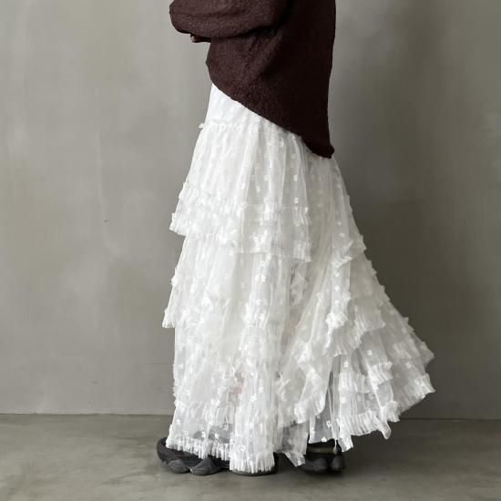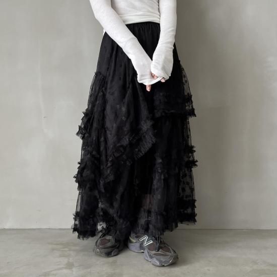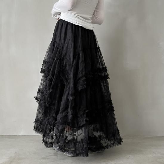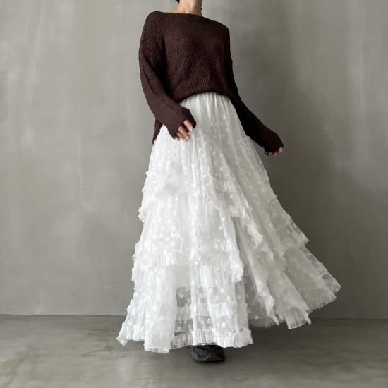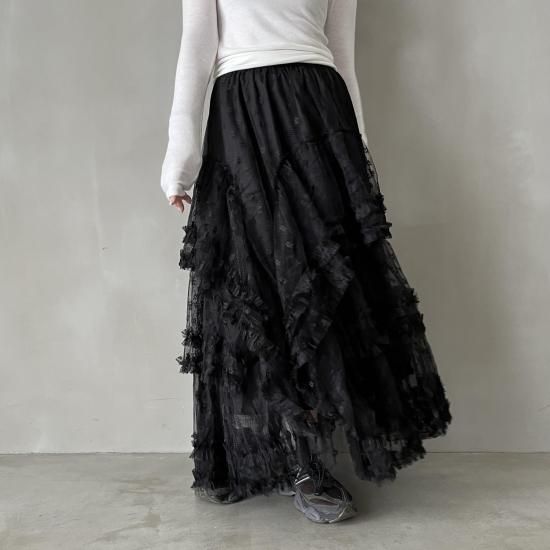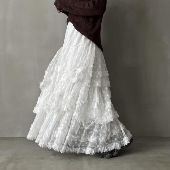 繊細なフラワーチュール生地を贅沢に重ね、華やかさと存在感を兼ね備えたスカート